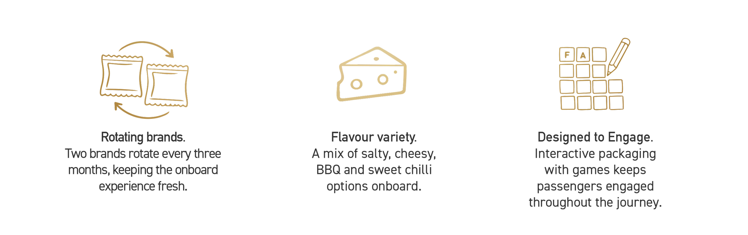 By introducing multiple brands, flavour profiles and interactive packaging, the offering evolves over time, giving passengers something new to discover on every journey.